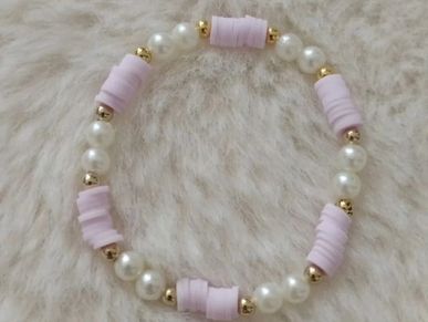 This bracelet combines soft pink and gold balls, with pearl accents . A perfect bracelet for wearing it with a special outfit or adding a sweet touch to your own style!