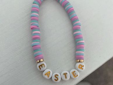 This playful bracelet features alternating red and colorful stripes with cute gold letters spelling EASTER centerpiece, perfect for adding a pop of color to any outfit. It's a sweet and stylish accessory to wear for Easter or any day you want to show a little extra dazzle!